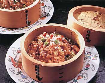 | 1.豚肉は長さ8〜10cmに切ります。ねぎ、生姜はみじん切りにします。グリンピースは熱湯でさっとゆでておきます。冷凍のグリンピースを使ってもかまいません。 2.調味料をボウルに合わせ、豚肉、ねぎ、生姜を入れてよく混ぜ合わせます。そこに上新粉をふり入れ、油を加えて全体を均一に混ぜ合わせます。ねぎは盛りつけの時にも使いますので少しだけ残しておきます。 3.キャベツは、大きくざく切りにします。 4.蒸し器をいったん火から下ろし、火傷をしないように巻きすを置き、そこにキャベツを広げて敷きます。 5.下味の付いた豚肉をキャベツの上にこんもりと盛りつけ、グリンピースを散らします。 6.蒸し器を再び火にかけ、約20分強火で一気に蒸します。 7.蒸し上がったら火から下ろし、巻きすごと持ち上げ、形を崩さないように皿に移します。最後に細かく刻んだねぎを散らし、温かいうちにいただきます。 〔備考〕蒸すときに使ったキャベツは豚肉と一緒に食べます。キャベツの歯触りが、料理を一層引き立たせます。  |